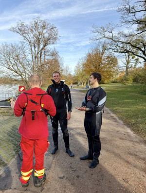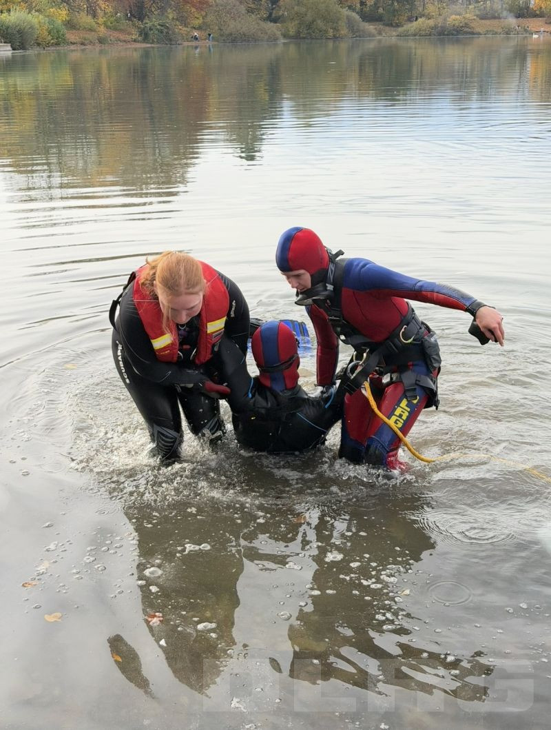 Die Ausbildung der Einsatztaucher:innen der Stufe 1 erfolgte im Rahmen einer bezirksweiten Ausbildungsinitiative und schloss mit einem Praxistag am Fasaneriesee in München ab.